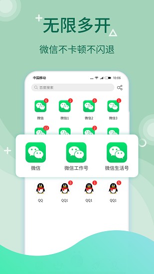 微多开分身官网免费版app可以在这里分身手机上所有软件,每天导入各种软件分身都是非常快的,还可以修改分身软件的名字以及图标。线上可以让本体与分身软件一起运行,登录多个账号都是非常轻松的,无需在一个软件切换账号。