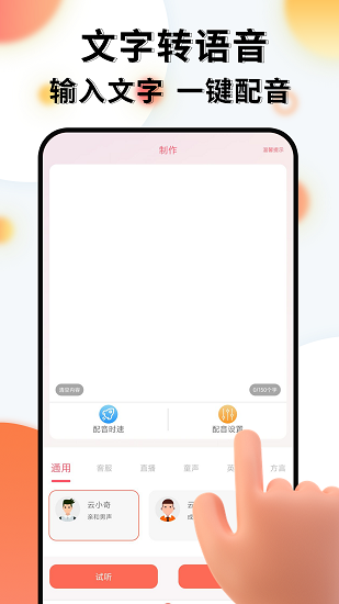输入文字一键转换成语音,选择自己喜欢的主播,添加背景音乐,设置语速,一键合成语音配音,适用于地摊叫卖、广告促销、商场宣传活动合成配音。
