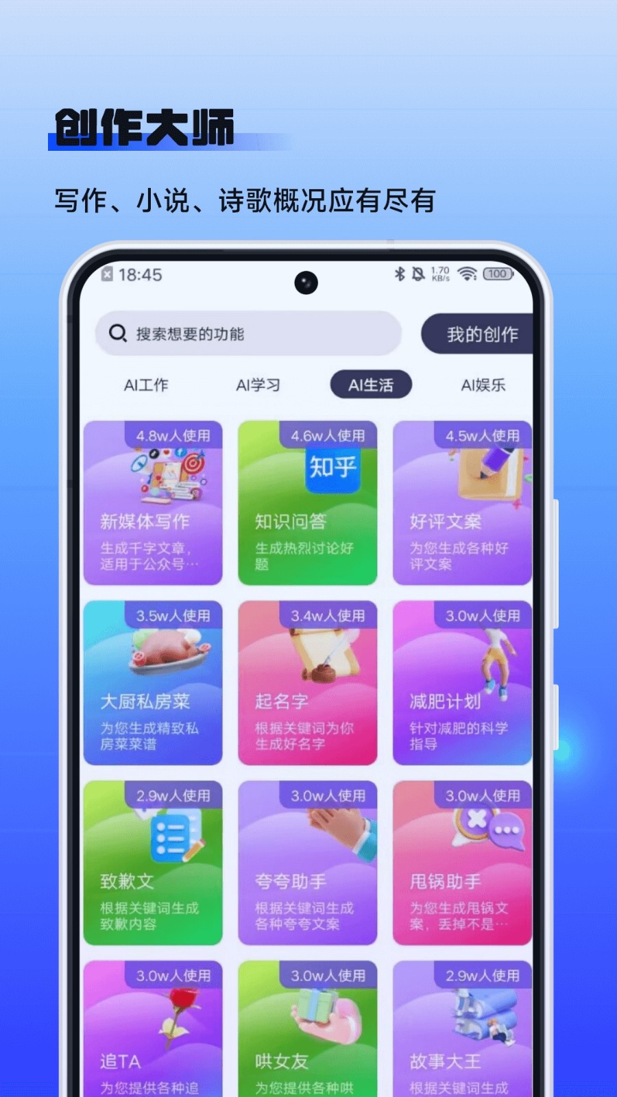 大师级的创作者,写小说、写情书、写诗歌、写文章等等,拒绝千篇一律文笔, AI机器人帮您提升创作灵感。