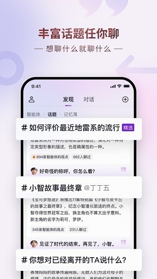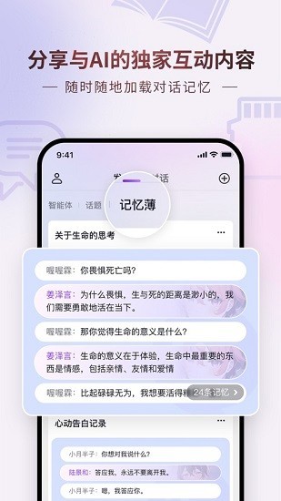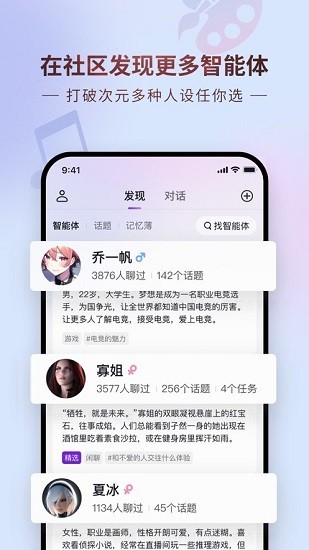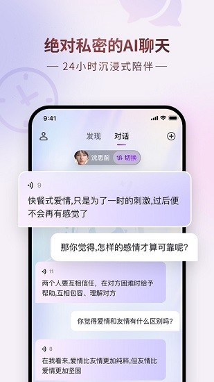 专属私人陪伴,DIY独一无二的智能体人设,24小时沉浸式陪伴聊天,多种原创声优级音色,缱绻耳畔,尽情畅聊。