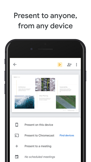 谷歌幻灯片app最新版本(Google幻灯片)可以让大家在手机上轻松的制作幻灯片,每天想怎么保存幻灯片都可以的,能够轻松的导出。线上可以快速的共享幻灯片给求他人,在线多人编辑幻灯片都非常的轻松,能够实时存储。