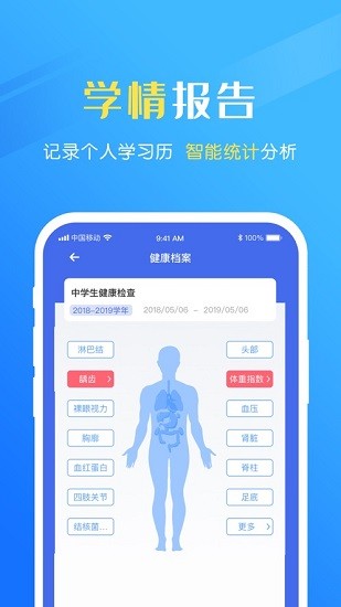 1、可以让中小学生免费使用这个平台,时刻关注自己的身体健康。