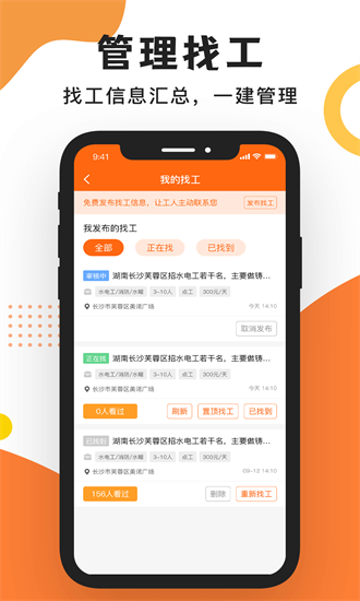 工友之家APP拥有丰富的工种选择,让您的就业选择更加灵活。同时,我们还有众多专业的师傅等待您的选择,为您提供专业的指导和帮助。通过一键管理找工信息,您可以轻松掌握最新的同城好活好工作信息,第一时间了解并把握机会。