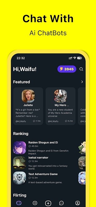 Hi Waifu软件可以帮助大家在这里创建独特的聊天机器人,你可以自行设定机器人的名字性别以及性格等,还可以为机器人设置头像的,想怎么调教自己创建的聊天机器人都行的。线上可以发现众多公开的聊天机器人,你可以随意的开聊。