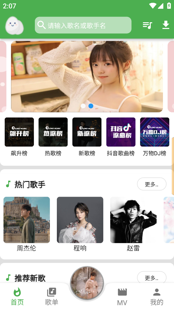 3. 免费播放,内置搜索引擎供用户使用,每天推荐好听的音乐给用户。