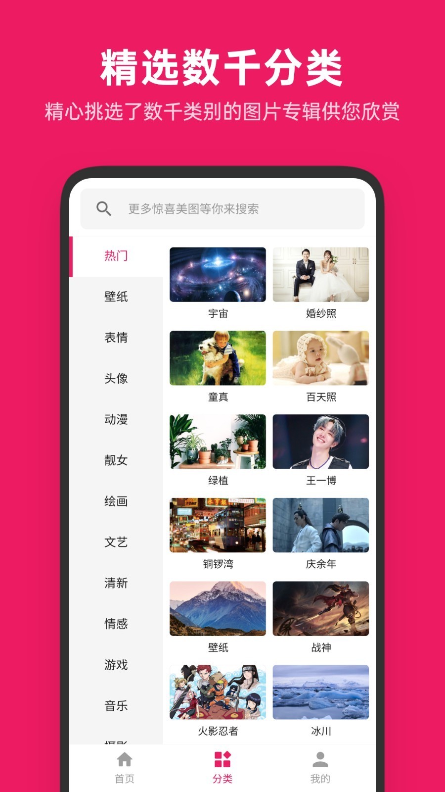 5. 我们精心挑选了众多分类的壁纸、表情、头像、动漫、绘画、文艺、清新、情感、游戏、音乐、摄影、时尚、旅行、设计、星座、动物、搞笑、读书、影视、花卉、科技、运动、美食、汽车、军事、婚嫁、教育、家居、健康等30余分类数千个子类的图片专辑,满足您多样化的视觉需求。