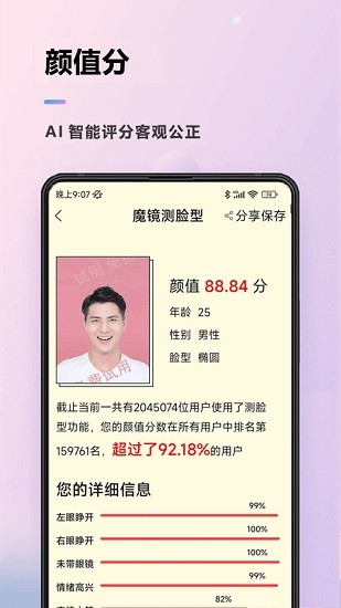 通过脸型分析智能系统,能快速高效的为您的颜值评分。
