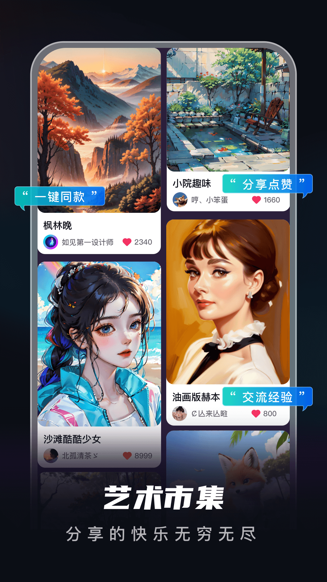 4、“艺术市集”记录生活美好瞬间,分享个人作品,沉浸艺术与创作的乐趣。 在这里,发挥你的想象力,开始你的数字艺术之旅!