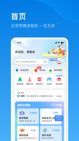 电信云宽带app让大家在互联网上订购各种云宽带产品,覆盖了超度的服务,让大家出门在外身处何处都可以使用云宽带的服务,能够让大家的网上飞快,还可以打开移动云盘存储各种文件,也可以为游戏进行加速等。
