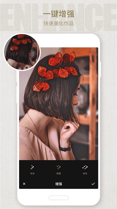 自动调整,快速校正图片的“增强”功能。 左右滑动整个屏幕即可快速调整照片的细节和层次。