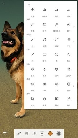 多功能工具箱:集结了多种实用工具,包括对称功能(支持四种类型的对称)、图层编辑(支持Photoshop混合模式)、导向工具(用于绘制简洁线条、椭圆等)以及三维透视工具。用户还可以进行选区和剪切蒙板操作。