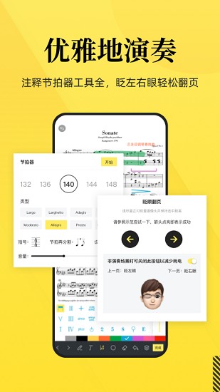功能强大的注释、录音、节拍器、术语翻译、跳页等辅助工具,还支持将录制的演奏音频和乐谱注释文件分享给其他乐手或师生;免打扰演奏模式,更专注更安心。