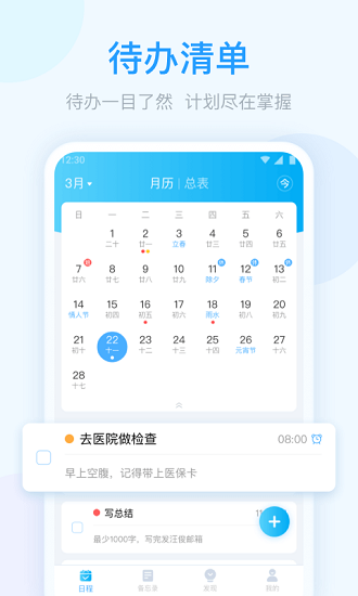 蜻蜓日历appp可以帮助大家在这里进行日程管理,随时都可以安排好自己的日程,添加新的待办事项也可以的,能够将重要的纪念日记录下来设置为提醒,各种法定节假日也可以在日历中进行查看的,让大家可以自由规划日程。