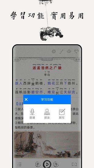 支持对照朗诵、逐句跟读、文本默写功能,对孩子学习国学诗词有帮助。