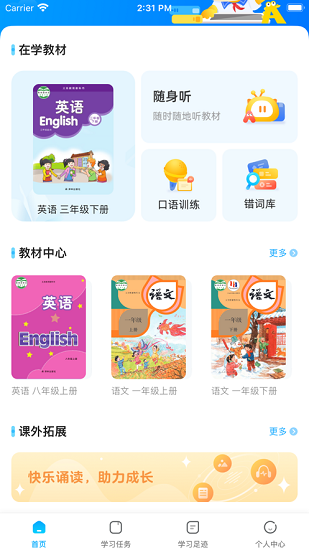 4、学习结束后,您可以进入“学习足迹”查看个人学习进度、我的录音和词汇量。点击“学习任务”模块,您还可以完成老师布置的学习内容。