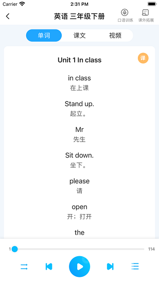 2、课本随身听包括单词、课文、视频三个标签,选择相应标签,点击“播放”按钮,即可开始学习。点击“目录”按钮,可以选择您想学习的单元。点击右上角的“译”按钮,可隐藏中文译文,再次点击“译”按钮,又可以显示中文译文。