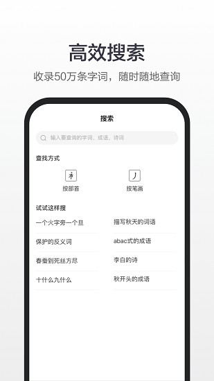 除常规字词精准查询方式外,提供多种灵活的查询方式,如“一开头的成语”、“爱组词”、“什么长什么短的成语” 、“李白的诗”等。