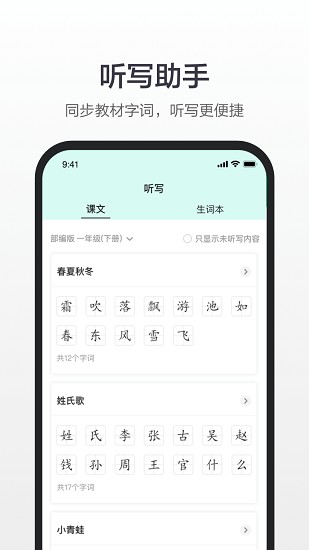 笔顺播放、译文对照、字词听写、作文助手等特色工具。