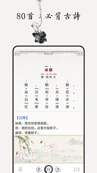 小学必背古诗词80首人教版app适用于小学生进行使用,每天无论是学习课本上的古诗词还是课外的古诗词都可以的,每一首古诗词都有详细的释义可以查看,还可以进行点读,想怎么进行学习都行的,能够轻松的进行背诵了。