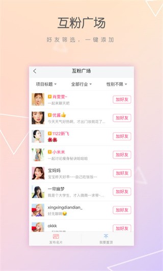 4、如果您想拥有更多粉丝,可以一键添加粉丝,拓展人脉,满足您的需求! 还有很多为微商定制的好玩又实用的功能,快来发现吧!