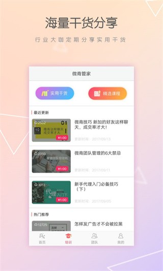 2、海量微商课程供您免费学习! 如何销售商品? 如何招募代理商? 如何成为受朋友尊重的微商? 这些问题你都可以在微信商务管家中找到答案!