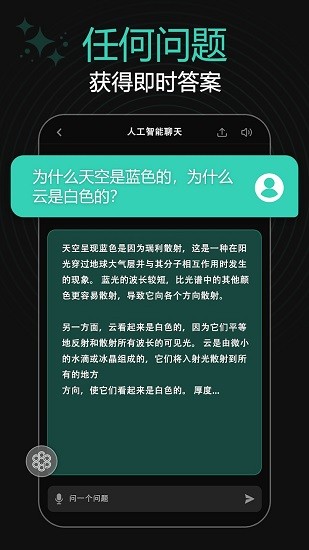 您的 GPT-4 和 ChatGPT 支持的聊天伙伴 Chat AI 已准备好深入探讨任何感兴趣的话题。 无论是体育、政治、科学,还是其他任何事情,Ask AI 总是热衷于聊天。