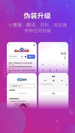 应用伪装成计算器,他人启动完全是计算器的样式,无法进入应用内部。输入指定密码才能进入应用内部,使用更加安全放心。