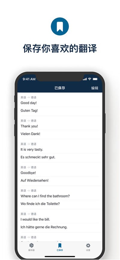 10、保存翻译:点击书签图标保存单词和短语以供将来参考,或创建您自己的词汇表(支持所有语言)