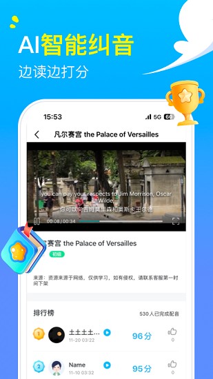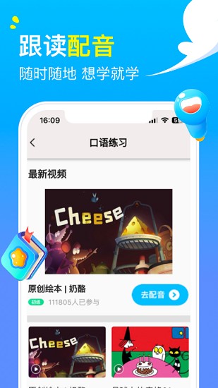 拥有丰富的口语演练视频、涵盖动画英语、经典影视、旅游英语等,并配备口语跟读智能打分,全方位提升英语技能,让英语学习不再枯燥。