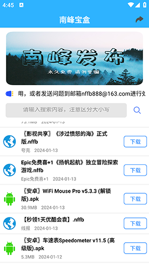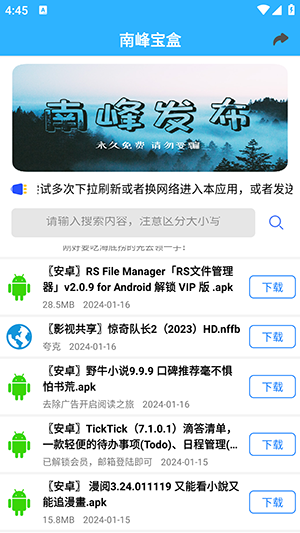 南峰宝盒最新版本是一款为用户带来了很多免费优质软件自由的分享平台,在这里包含了影视,音乐,小说,漫画,动漫,游戏,辅助等等丰富的软件,让你可以不用花钱开会员直接获取所有的功能,快来下载体验吧!