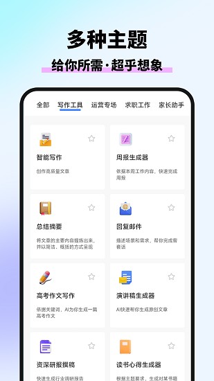 1、为大家带来了非常实用的AI写作工具,可以按照自己的需求来写作。