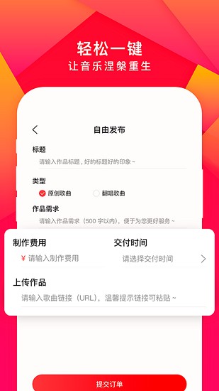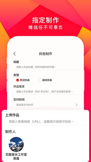 〖自由发布〗用户可以在自由市场中发布您对音乐的需求,并在“服务”板块查看您的需求状态。