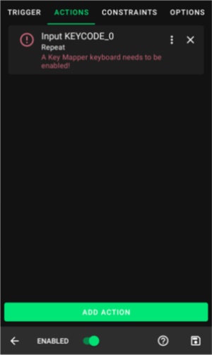 对于这个简单的演示,我将从KEYCODE选项卡中选择KEYCODE_0。这个动作将模拟按键盘上的0键。键映射器会让你知道你是否需要做任何额外的步骤,使行动可以工作。在图片中,操作中有一条错误消息,告诉您“启用”一个键映射器键盘。轻按该操作会将您带到正确的位置,以便您可以修复错误。我将介绍如何设置一个关键代码动作,因为这些是最常用的。