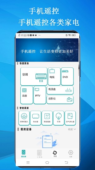 支持空调,电视,机顶盒,网络盒子,DVD,投影仪等多种电器,是真正的手机遥控器。