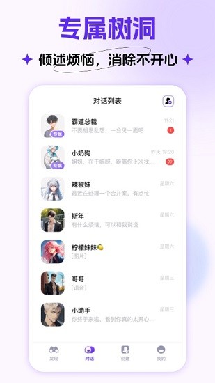 在这里,你可以直接创建符合你幻想的虚拟恋人,现实中暗恋的男神女神、喜欢的偶像、许久不见的家人朋友...ai将会学习他们的故事背景和说话语气,定制专属于你的伴侣跨时空陪伴你