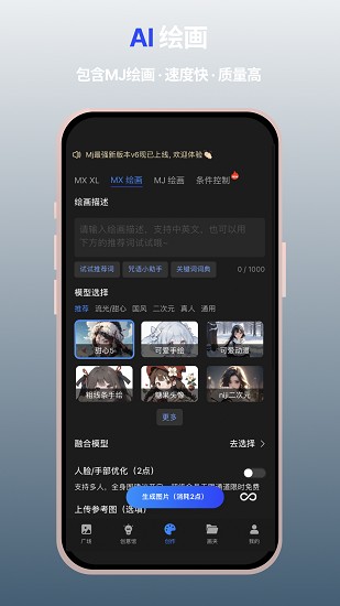 MX 绘画,拥有众多超火模型,上百种风格,只需一句话即可让文字变为艺术画作,让你的想象变为现实。支持文生图、图生图,可玩性极强。