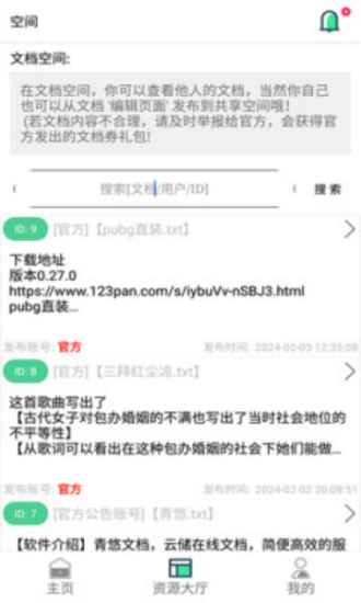 3、访问资源大厅,浏览他人分享的文档,您也可从文档编辑页面将内容发布至共享空间。