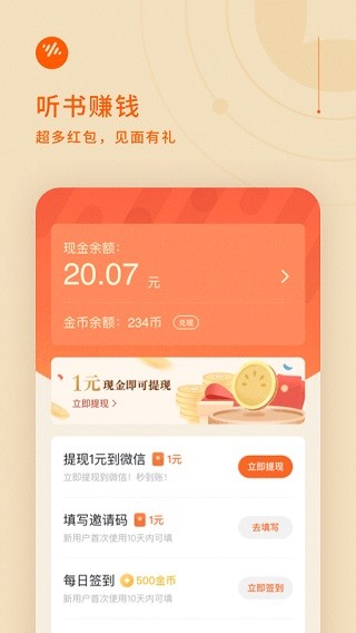 番茄畅听赚钱版是一款可以听小说赚钱的软件,在这里用户可以免费收听官方授权的免费小说,可供用户选择的类别很多,包括都市小说、悬疑惊悚、穿越爱情、玄幻仙侠、武侠等。再也不用担心没有书可听,除此之外,它还有一个最强的好处就是用户可以在这里听书赚钱,他们一上线就会得到1元现金,可以提取,用户还可以每天看书赚零花钱、签到赚钱、开宝箱赚钱,红包福利一应俱全,可以随时提现,有需要的用户赶紧下载来试试吧。
