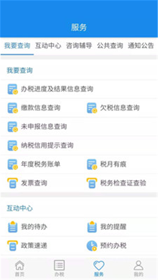 纳税人可以通过该版块操作“我要查询”、“互动中心”、“咨询”、“公开查询”、“通知公告”五个功能类别。