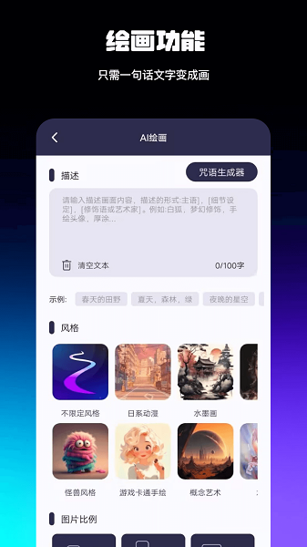 让文字展现出艺术的气息,仅输入你下个描述的文字,点击生成,就能给你画出所描述的画作,超多风格可以选择,一切都取决于你的想象力