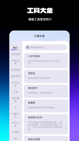 AI智能百科全解软件可以让大家安全的使用AI工具,每天与智能机器人聊天都是非常轻松的,能够快速的得到回复,想怎么进行使用都行的。平台上带来的AI工具都是进行了分类,大家可以轻松筛选自己想使用的工具了。