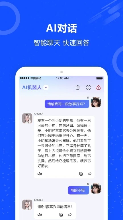 AI对话机器人app是一款免费开放的智能聊天对话ai工具,你可以体验全新的智能聊天。为用户带来了全方位的智能百科,可以让你解决各种各样的问题,还能得到24小时的实时对话回应,让你再也不会孤独。