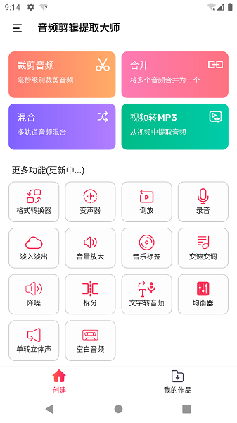音频剪辑提取大师永久免费app可以让大家在这里自由编辑音频文件,怎么导入音频文件都行的,能够根据自己的需求拼接多段音频,都可以及时的进行保存,怎么进行分享都可以的。线上可以从视频中提取音频,每次转换起来很轻松。