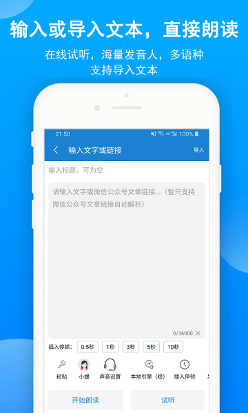 1、支持文字和链接复制语音阅读,字数没有限制。