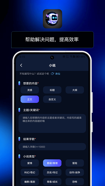 根据使用者输入的关键词或语句,生成新的创意内容。