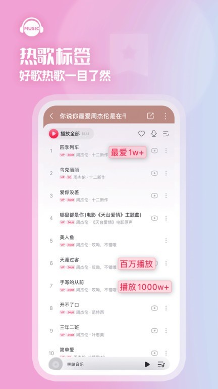 咪咕音乐极速版是一款可以收听正版音乐的软件,您还可以在这里免费聆听周杰伦、五月天、田馥甄等正版付费音乐,其他平台需要付费的歌曲可以在这里直接收听,很多人都在使用免费软件,所以不用花钱就可以听,正版歌曲资源,为用户提供大量优质歌曲的免费在线试听服务特权,让用户享受美妙的音乐,滨崎步、幸田来未、大冢爱、Little Things Band、PIKO太郎、AAA,你想要的日本音乐大咖都在这里,可让您免费在线收听各种音乐的软件,给用户带来非常好的播放体验,为用户提供海量音乐免费聆听无损,纯粹的享受,有需要的用户赶紧下载来试试吧。