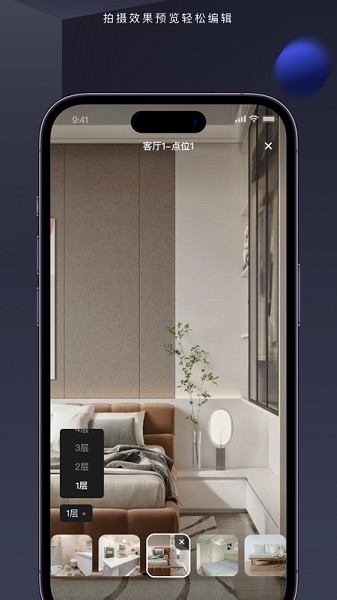 使用临感VRAPP连接全景相机后,可根据预设房间顺序移动相机,一点即拍,轻松无成本,拍完即预览,轻松选择。