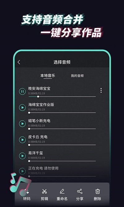 2、【音频合并】本产品支持将多个音频文件合并为一个新的音频文件。