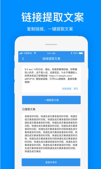 文案提取软件是一款可以提取文档内容的工具,它可以帮助用户从文件中提取文本信息。同时,它还可以识别图像中的文本信息,并将其转换为可编辑的文本,而且,它还可以将音频识别转换为文本信息,非常好用,实时语音转文字在线录音转文字,准确快速,提高办公或学习效率,方便省心语音转文字、音频转文字、文字识别、文字提取、听写、音频提取等, 可以将实时录音内容准确、快速地转换为文本,并提取文本内容,有需要的用户赶紧下载来试试吧。