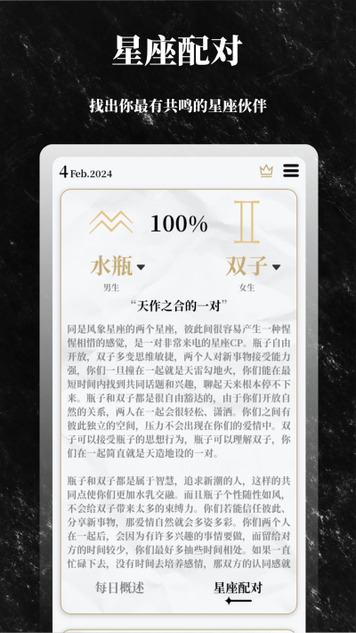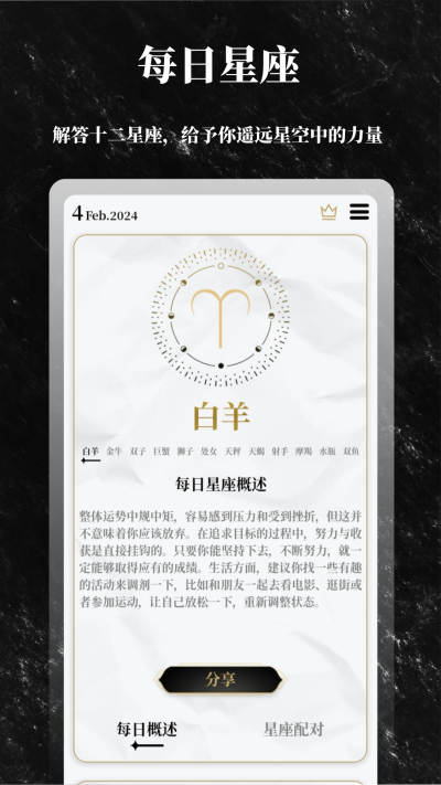 3、每日星座运势:查看每日星座运势分析,解答遥远星辰中的未知答案。 同时,还有十二生肖的任意配对分析,帮助您更好地了解十二生肖之间的关系指数。
